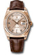 36mm 18K Everose gold case, screw-down crown, fluted bezel, pink dial, Roman numerals, Rolex calibre 3155 automatic movement with instantaneous date and day windows, approximately 48 hours of power reserve, brown leather strap, folding buckle. Waterproof to 100 meters.