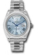 40mm 950 platinum case, screw-down back with Rolex fluting, screw-down crown with twinlock double waterproofness system, smooth bezel, scratch-resistant double anti-reflective sapphire crystal with cyclops lens over the date, ice blue diagonal motif dial, index hour markers with Chromalight, Rolex calibre 3255 automatic movement with centre hour, minute and seconds...