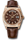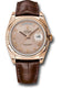 36mm 18K Everose gold case, screw-down crown, fluted bezel, pink dial, diamond hour markers, Rolex calibre 3155 automatic movement with instantaneous date and day windows, approximately 48 hours of power reserve, brown leather strap, folding buckle. Waterproof to 100 meters.