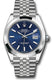 41mm Oystersteel case, screw-down back, screw-down crown with twinlock double waterproofness system, smooth bezel, scratch-resistant sapphire crystal with cyclops lens over the date, bright blue fluted motif dial, index hour markers, Rolex calibre 3235 perpetual self-winding movement with centre hour, minute and seconds hands, instantaneous date with rapid setting, and...