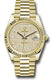 40mm 18K yellow gold case, screw-down back with Rolex fluting, screw-down crown with twinlock double waterproofness system, fluted bezel, scratch-resistant double anti-reflective sapphire crystal with cyclops lens over the date, champagne dial, Roman numerals, Rolex calibre 3255 automatic movement with centre hour, minute and seconds hands, instantaneous day and date in apertures, unrestricted rapid-setting, and stop-seconds for precise time setting, approximately 70 hours of power reserve, President bracelet with three-piece solid links comprised of a polished center link, satin-finished outer links, and ceramic inserts, concealed folding Crownclasp buckle. Waterproof to 100 meters.