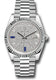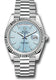 40mm platinum case, screw-down back, screw-down crown with twinlock double waterproofness system, fluted bezel, scratch-resistant sapphire crystal with cyclops lens over the date, ice blue dial, 10 baguette-cut hour markers, Rolex calibre 3255 perpetual self-winding movement with centre hour, minute and seconds hands, instantaneous day and date in apertures, unrestricted...