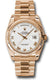 36mm 18K pink gold case, fluted bezel, white dial, stick hour markers, and President bracelet.