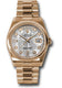 36mm 18K pink gold case, domed bezel, white dial, Roman numerals, and President bracelet.