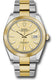 41mm Yellow Rolesor case with 904L steel monobloc middle case, screw-down steel back, 18K yellow gold screw-down crown, 18K yellow gold smooth bezel, scratch-resistant double anti-reflective sapphire crystal with cyclops lens over the date, mother-of-pearl dial, diamond hour markers, Rolex calibre 3235 perpetual self-winding movement with date at 3 o'clock...