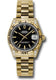 31mm 18K yellow gold case, fluted bezel, case lugs set with 24 diamonds, black dial, index hour markers, and President bracelet.