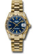 31mm 18K yellow gold case, fluted bezel, case lugs set with 24 diamonds, blue dial, index hour markers, and President bracelet.