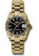 31mm 18K yellow gold case, fluted bezel, case lugs set with 24 diamonds, black dial, index hour markers, and President bracelet.